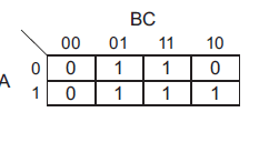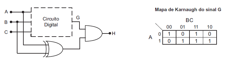 A figura acima apresenta parte de um circuito digital e o Mapa de Karnaugh do sinal G, gerado a partir dos sinais A, B e C. Neste caso, o Mapa de Karnaugh correspondente ao sinal H é
