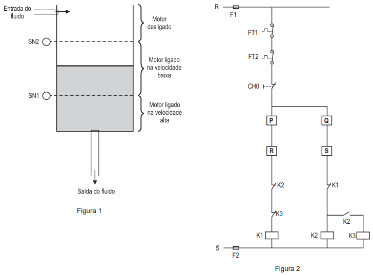 No circuito auxiliar da Figura 2, a contatora K1 deve ser acionada quando o motor for ligado na velocidade baixa, e as contatoras K2 e K3 devem ser acionadas quando o motor for ligado na velocidade alta. Quando o motor está desligado, nenhuma contatora deve ser acionada. Os contatos devem estar dispostos, no circuito auxiliar, no estado em repouso. Os blocos P e Q são contatos do SN1, e os blocos R e S são contatos do SN2. Dessa forma, quais devem ser os contatos utilizados em cada bloco, para que o circuito auxiliar da Figura 2 funcione adequadamente no acionamento proposto na Figura 1?