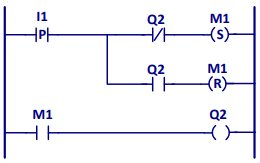 O diagrama Ladder possui uma função de detecção de borda de subida por I1 e saídas Set e Reset em M1.