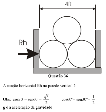 Um cilindro homogêneo de massa M e raio R se apóia em outros dois cilindros homogêneos, que também possuem massa M e raio R e se apóiam em paredes verticais, cuja distância entre elas é igual a 4R.