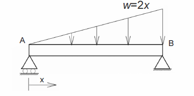 Suponha que uma viga biapoiada sofra a ação de um carregamento distribuído expresso pela relação w = 2x, em que x é medido a partir do apoio móvel, localizado no ponto A, conforme ilustrado na figura abaixo. Se a unidade de carregamento distribuído estiver expressa em N/m e a viga medir 6 m de comprimento, então a reação do apoio B terá módulo igual a 24 N.