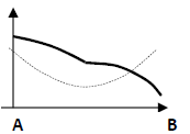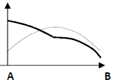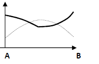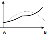 A expressão que indica corretamente como se comporta a pressão (linha contínua) e a velocidade (linha pontilhada) ao longo da trajetória ABC é: