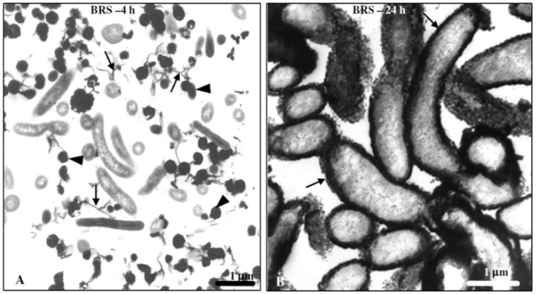 A microscopia eletrônica trouxe um grande avanço para a Microbiologia, ela é uma técnica muito utilizada nos estudos dos biofilmes. Devido ao seu alto poder de resolução, de cerca de 0,2 nm, é possível obter informações detalhadas sobre a distribuição e ultraestrutura das células. A figura a seguir mostra o aspecto em microscopia eletrônica de transmissão (MET) e análise elemental do biofilme pré-formado de 90 dias, após 4 (A) e 24 h (B), respectivamente, sobre os corpos de prova imersos em água corrente desaerada sob condições estáticas de fluxo d'água.