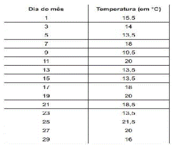 Uma equipe de especialistas do centro meteorológico de uma cidade mediu a temperatura do ambiente, sempre no mesmo horário, durante 15 dias intercalados, a partir do primeiro dia de um mês. Esse tipo de procedimento é freqüente, uma vez que os dados coletados servem de referência para estudos e verificação de tendências climáticas ao longo dos meses e anos. As medições ocorridas nesse período estão indicadas no quadro: