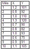 representa uma aproximação plausível para o ajuste dos dados da tabela abaixo. Tais dados representam pares de observações (Xt,Yt) ao longo de 10 meses escolhidos ao acaso. Na equação do modelo linear são parâmetros desconhecidos e os erros