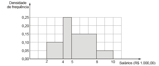 A distribuição dos salários dos 200 funcionários, em R$ 1.000,00, de determinada carreira profissional em um órgão público está representada pelo histograma abaixo. No eixo vertical estão assinaladas as respectivas densidades de frequências, em (R$ 1.000,00)−1. Define-se densidade de frequência de um intervalo de classe como sendo o quociente da divisão da respectiva frequência relativa pela correspondente amplitude do intervalo.