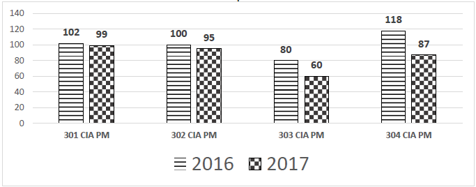 O 150º Batalhão é responsável pela 301ª CIA PM, 302ª CIA PM, 303ª CIA PM e 304ª CIA PM. Nesse Batalhão, no ano de 2017, todas as CIAS PM obtiveram redução percentual (%) nos crimes em relação ao ano de 2016. Com base nas informações contidas no gráfico abaixo, marque a alternativa CORRETA.
