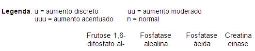 As enzimas, proteínas catalisadoras que são responsáveis pela maioria das reações químicas do corpo, estão presentes em todos os tecidos. Atualmente, muitas enzimas foram identificadas no soro e os níveis dessas enzimas foram estudados extensivamente em várias condições. Analise a tabela abaixo, que demonstra os valores anormais de algumas enzi-mas em 4 doenças, e assinale a afirmativa INCORRETA.