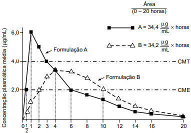 O gráfico a seguir apresenta as curvas da variação da concentração sérica em função do tempo (0 a 20h) para duas formulações (A e B) da mesma dose, do mesmo fármaco, administrado por via oral.