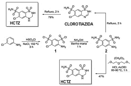 A hidroclorotiazida (HCTZ), assim como outros diuréticos tiazídicos, é sintetizada partindo de derivados de cloroanilina, conforme apresentado no esquema. Na primeira etapa, a m-cloroanilina é submetida a uma reação de clorosulfonilação, por meio do tratamento com ácido clorossulfônico, levando à formação de 1. Na sequência, por meio do tratamento com hidróxido de amônia, 1 é convertido em 2. A partir do composto 2, a HCTZ pode ser obtida de duas maneiras diferentes. Em uma dessas metodologias, a clorotiazida é obtida por meio do tratamento com ______________ em refluxo. A clorotiazida, que também é um diurético, porém menos eficaz, é então reduzida com ______________ levando à formação da hidroclorotiazida, com 79% de rendimento. Contudo a hidroclorotiazida também pode ser obtida diretamente a partir da _______________ de 2 com paraformaldeído, conforme apresentado no esquema.