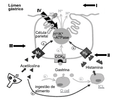 O esquema a seguir ilustra a bomba de prótons de uma célula parietal, e as setas (I a IV) os possíveis mecanismos pelos quais medicamentos podem agir para o tratamento e a prevenção de gastrites e úlceras pépticas.