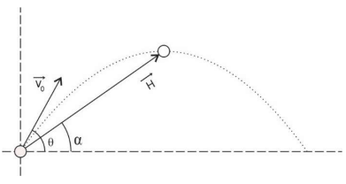 Uma partícula é lançada obliquamente e descreve um movimento parabólico, sem resistência do ar. No momento do lançamento dessa partícula, o vetor velocidade (v0) faz o ângulo θ com a horizontal e, ao atingir a altura máxima de sua trajetória, o vetor posição H da partícula faz um ângulo α com essa mesma horizontal, conforme ilustra figura a seguir: