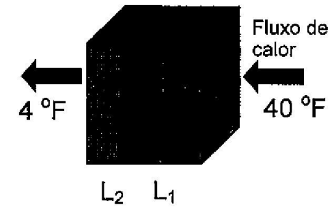 Dados: k1 = 0,10 W/mºC); k2 = 0,20 W/(m ºC); L1 = 0,10 m; L2 = 0,040 m; A1 = A2 = 30m²; T1 = 4,0 ºF, e T2 = 40ºF.