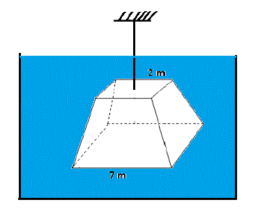 O tronco de uma pirâmide está submerso a 4 m de profundidade da superfície da água ao topo do tronco da pirâmide que possui uma altura 5 m. A densidade da água é de 1030 kg/m³ e2 a massa da pirâmide é de 223 x 105 kg/m³.