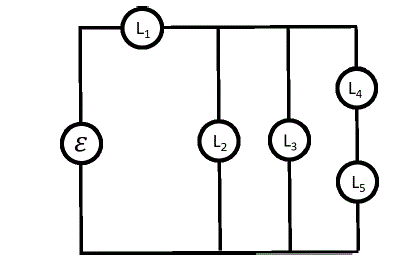 Observe o circuito a seguir, composto por uma fonte de força eletromotriz ideal ε e por 5 lâmpadas iguais. A luminosidade dessas lâmpadas é representada por L1, L2, L3, L4 e L5.