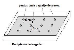 Após o tempo normal para o derretimento do queijo, o forno é desligado e aberto. O jovem percebeu que a cobertura de queijo apresentava um padrão retangular de pontos em que o queijo derreteu e entre esses pontos o queijo não derreteu. Entre os pontos que o queijo derreteu, ele percebeu que a distância era sempre de 6,0 cm, conforme a figura: