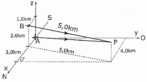 Uma aeronave de patrulha A segue, com velocidade escalar constante VA, rumo ao ponto P com a finalidade de interceptar outra aeronave, B, a qual mantém altitude e velocidade escalar constante e, inicialmente, encontra-se 1,00 km ao norte (sentido positivo de x) e 2,00 km acima de A. Sabendo que a aeronave B percorre 5,00 km em 30,0 segundos antes de ser interceptada no ponto P, a diferença, VA − VB, entre as velocidades escalares das duas aeronaves, em km/h, é igual a: