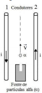 Partículas alfa (α), compostas de dois prótons e dois nêutrons, são arremessadas com velocidade inicial não nula em uma trajetória, inicialmente retilínea, equidistante e coplanar aos condutores, conforme a figura.