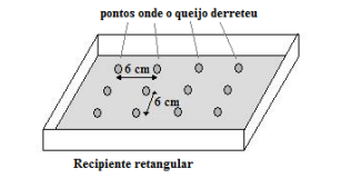 Após o tempo normal para o derretimento do queijo, o forno é desligado e aberto. O jovem percebeu que a cobertura de queijo apresentava um padrão retangular de pontos em que o queijo derreteu e entre esses pontos o queijo não derreteu. Entre os pontos que o queijo derreteu, ele percebeu que a distância era sempre de 6,0 cm, conforme a figura: