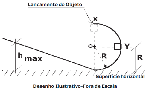 O desenho abaixo mostra um semicírculo associado a uma rampa, em que um objeto puntiforme de massa m, é lançado do ponto X e que inicialmente descreve uma trajetória circular de raio R e centro em O.