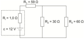 Um circuito elétrico é composto por uma bateria, de força eletromotriz ε = 12 V e resistência interna Ri = 1,0 Ω, e por três resistores ôhmicos de resistências R1 = 59 Ω, R2 = 30 Ω e R3 = 60 Ω, como ilustrado na figura.