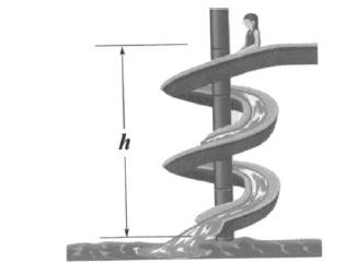 A figura acima mostra uma criança descendo em um toboágua. Admitindo que ela é liberada do topo, a uma altura h = 8 m em relação à base, com velocidade inicial igual a zero, que a aceleração da gravidade, g, é igual a 10 m/s2 e desconsiderando as forças de atrito, então o módulo, da velocidade da criança na parte mais baixa do toboágua será mais próximo de