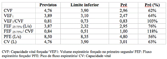 Paciente do sexo masculino, 32 anos, 1,75m, 70kg, há 1 ano com diagnóstico médico de Miastenia Gravis, foi encaminhado pelo Pneumologista ao laboratório de Prova de Função Pulmonar para realização do exame de espirometria. Negou história prévia de tabagismo. Com base nos dados abaixo, qual o diagnóstico espirométrico e o grau de alteração desse paciente?