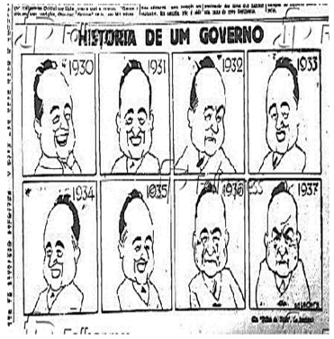 As expressões faciais do presidente em cada quadrinho ilustram os mais diferentes momentos que marcam a administração getulista como o governo provisório, governo constitucionalista e a ditadura do Estado Novo.