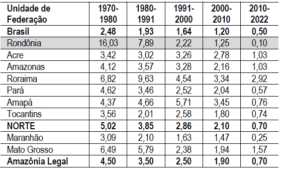 Observe a tabela a seguir, sobre a Taxa de Crescimento Geométrico (%) da População Brasileira, com destaque para o estado de Rondônia.