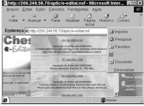 Em uma sessão de uso do Internet Explorer 5, executado em um computador cujo sistema operacional é o Windows 98, um usuário, interessado em obter informações acerca de editais de licitações existentes no site da CHESF, obteve a página Web ilustrada na figura abaixo. Com base nessa figura e com relação ao Internet Explorer 5 e ao Windows 98, julgue os itens a seguir.