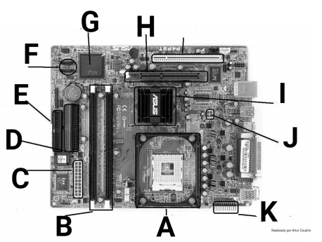 D- Slot Memória DDR, F-Processador, C-Conector da fonte de alimentação.