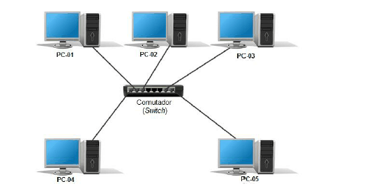 Um técnico em informática, servidor do IFCE, montou uma rede de área local (acrônimo de local area network – LAN) que interliga 5 computadores no mesmo espaço físico. Os computadores, nessa rede, estão ligados por cabos par trançado a um comutador (Switch) que filtra e encaminha pacotes entre os computadores da rede, conforme a figura abaixo.