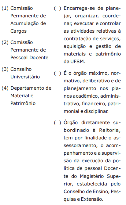 Com base no que dispõe o Regimento Geral da Universidade Federal de Santa Maria, associe os órgãos da UFSM apresentados na coluna à esquerda às descrições presentes na coluna à direita.