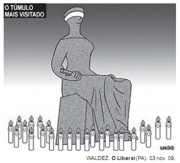 Considerando que a charge acima foi publicada no dia seguinte a finados, sua construção, por meio de linguagem não verbal, tem o objetivo de