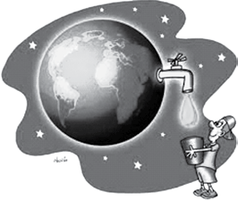 a água no planeta é inextinguível, segundo a charge, e os países ricos encontrarão um meio de fornecê-la às populações pobres.