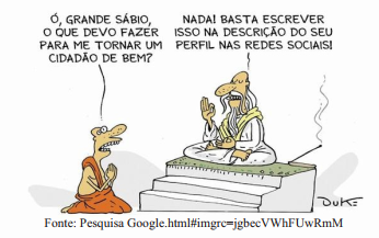 Leia a charge a seguir e analise as proposições, em relação ao uso da tecnologia pelas pessoas e suas experiências em todos os contextos, inclusive na escola.