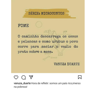 O Texto 4 consiste em post feito pela contista esperancense Vanuza Duarte, em seu perfil na rede social Instagram. O Texto 5, por sua vez, traz uma notícia do site G1 sobre a situação da fome no Brasil. Sua leitura é necessária para responder as questões de 11 a 15: