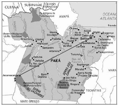 O mapa do estado do Pará ilustrado acima está desenhado na escala 1:17.000.000, ou seja, uma distância de 1 cm no mapa corresponde à distância real, em linha reta, de 17 milhões de centímetros. Ao medir, com a régua, a distância no mapa entre Jacareacanga e Belém, um estudante encontrou 6,7 cm. Com base apenas nessas informações, é correto o estudante concluir que a distância real, em linha reta, entre essas duas cidades é