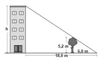 João baseia-se na estratégia usada por Tales de Mileto para estimar a altura do prédio onde mora. Para isso ele mede com uma trena a altura de uma árvore e as sombras projetadas no chão pela árvore e pelo prédio em determinado instante, conforme a figura.