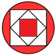 Na figura a seguir, os pontos em comum dos vértices dos quadrados internos são os pontos médios dos lados dos quadrados externos, e o diâmetro da circunferência que os circunscreve é √2 cm. Pode-se concluir corretamente que a área do quadrado vermelho interno é: Se necessário, considere que √2 = 1,4.