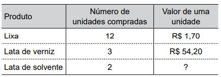 Jorge fez uma compra em uma loja de tintas. A tabela a seguir mostra o número de unidades compradas de cada produto e o valor unitário do produto: