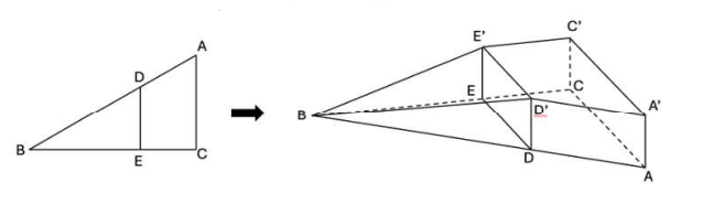 A seção transversal da base comum aos dois sólidos foi desenhada a partir de um triângulo retângulo ABC, onde DE é perpendicular a BC e AC = BE. Sabe-se que BD = 1/2 cm, a soma dos segmentos DE + BC = 1 cm e que a altura (profundidade) de todo o conjunto é de 5 cm. Considerando que a pirâmide está posicionada com sua base retangular EDD’E’ acoplada ao prisma, o volume total desse objeto, em cm³, é de: