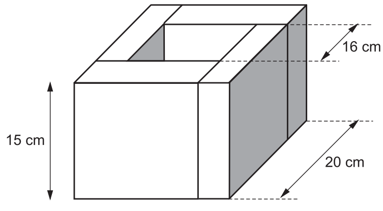 Cada bloco tem altura 15 cm, e os lados dos quadrados maior e menor da peça (contorno e furo) são, respectivamente, 20 cm e 16 cm.