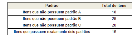Cada item em estoque de um depósito é classificado em um, dois ou três dos padrões A, B e C. Em um mês esse depósito tinha em estoque 43 itens, classificados conforme a tabela a seguir.