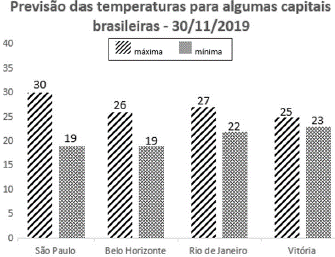 No gráfico a seguir, estão representadas as temperaturas máximas e mínimas previstas para quatro capitais brasileiras no dia 30/11/2019.