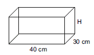 A figura mostra as medidas internas de uma caixa metálica, na forma de um prisma reto de base retangular, com 40 cm de comprimento por 30 cm de largura e altura H, que se encontra vazia.