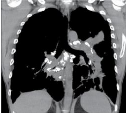 Paciente do sexo feminino, 46 anos, sem histórico de tabagismo, queixando-se de tosse seca e cansaço. A paciente realizou tomografia computadorizada como parte da rotina diagnóstica.