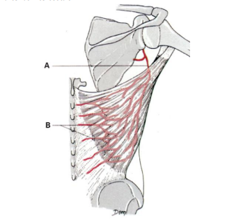 A imagem a seguir representa o músculo grande dorsal, em que A representa o seu pedículo vascular dominante originado da artéria toracodorsal, e B, seus pedículos secundários oriundos das artérias intercostais.