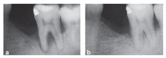 Aspecto radiográfico de um defeito na área de furca antes do tratamento (a) e 6 meses após o tratamento (b).