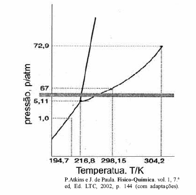 Com base no diagrama de fases experimental do dióxido de carbono, representado na figura acima, assinale a opção que indica a pressão atmosférica mínima necessária para a ocorrência da fase líquida desse gás e sua pressão de vapor em temperatura ambiente, respectivamente.